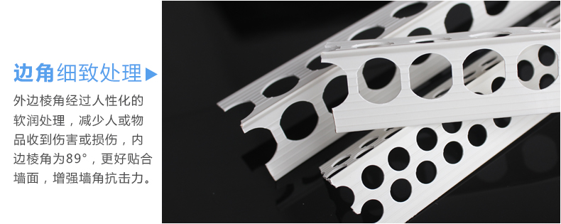 2、外边棱角经过人性化的软润处理,减少人或物品受到伤害或损伤,内边棱角为89°,更好贴合墙面,增强墙角抗击力;